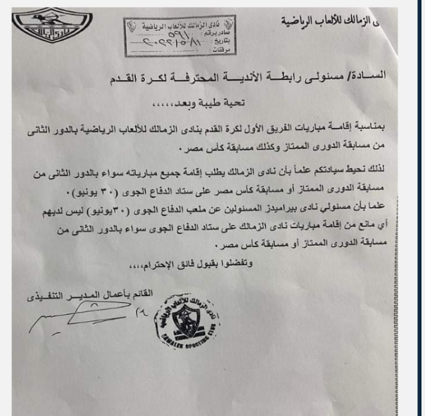 خاطب نادي الزمالك رابطه الانديه من اجل نقل مبارياته من استاد القاهرة الدولي الي استاد الدفاع الجوي ورد مصدر مسؤل في نادي الزمالك علي مثيرو الشائعات حول عدم وجود مخاطبات من النادي لرابطة الأندية من أجل نقل مبارياته في الدور الثاني من بطولة الدوري الممتاز للموسم الحالي 2021-2022، وكذلك ببطولة كأس مصر من استاد القاهرة إلى ملعب الدفاع الجوي.