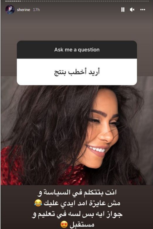 كالعاده ما تفتح الفنانه شرين عبد الوهاب خاصيه الاسئله علي حسابها الخاص على موقع التواصل الاجتماعي إنستجرام وتتفاجئ بسؤال غريب وهو خطبه ابنتها الكبيره من احد متابعيها حيث ارسل لها قائلا: “أريد أخطب بنتك”.