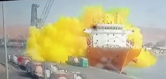 كارثه وقعت منذو لحظات في الاردن القيق خاصه في ميناء خليج العقبه حيث سقط صهريج الغاز السام في ميناء العقبة وعلي الفور قد فر عمال الميناء من محيط الانهيار كما فرت الطيور والكائنات الحية على الفور من مكان الحادث الذي امتلأ بالغاز السام.