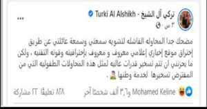 علق تركي آل الشيخ عبر وسائل التواصل الاجتماعي ، عن تداول بعض الأخبار ، وكتب الشيخ على صفحته الرسمية على “فيس بوك”: مضحك جدا المحاولة الفاشلة لتشويه سمعتي وسمعة عائلتي عن طريق اختراق موقع إخباري إعلامي معروف .